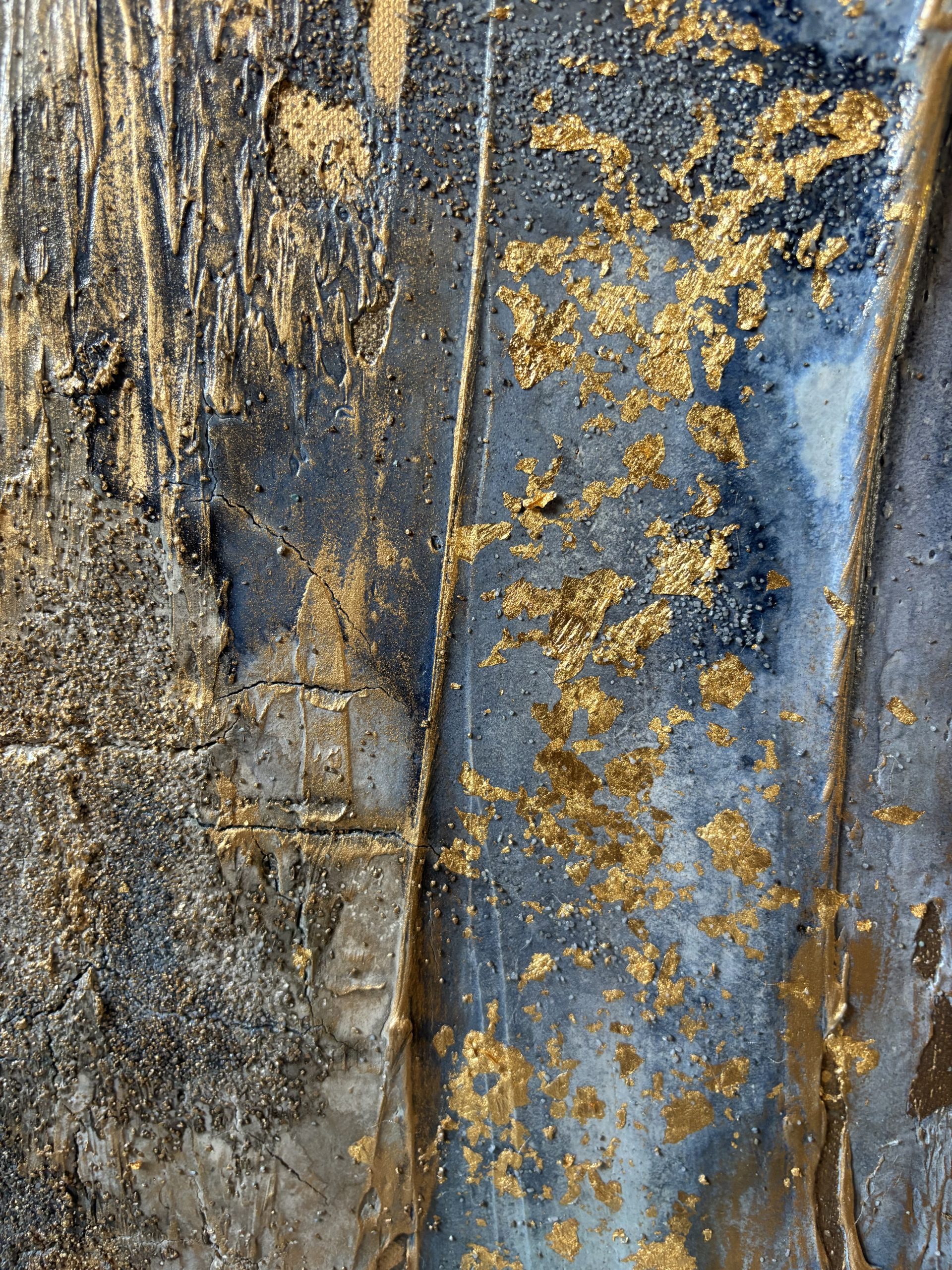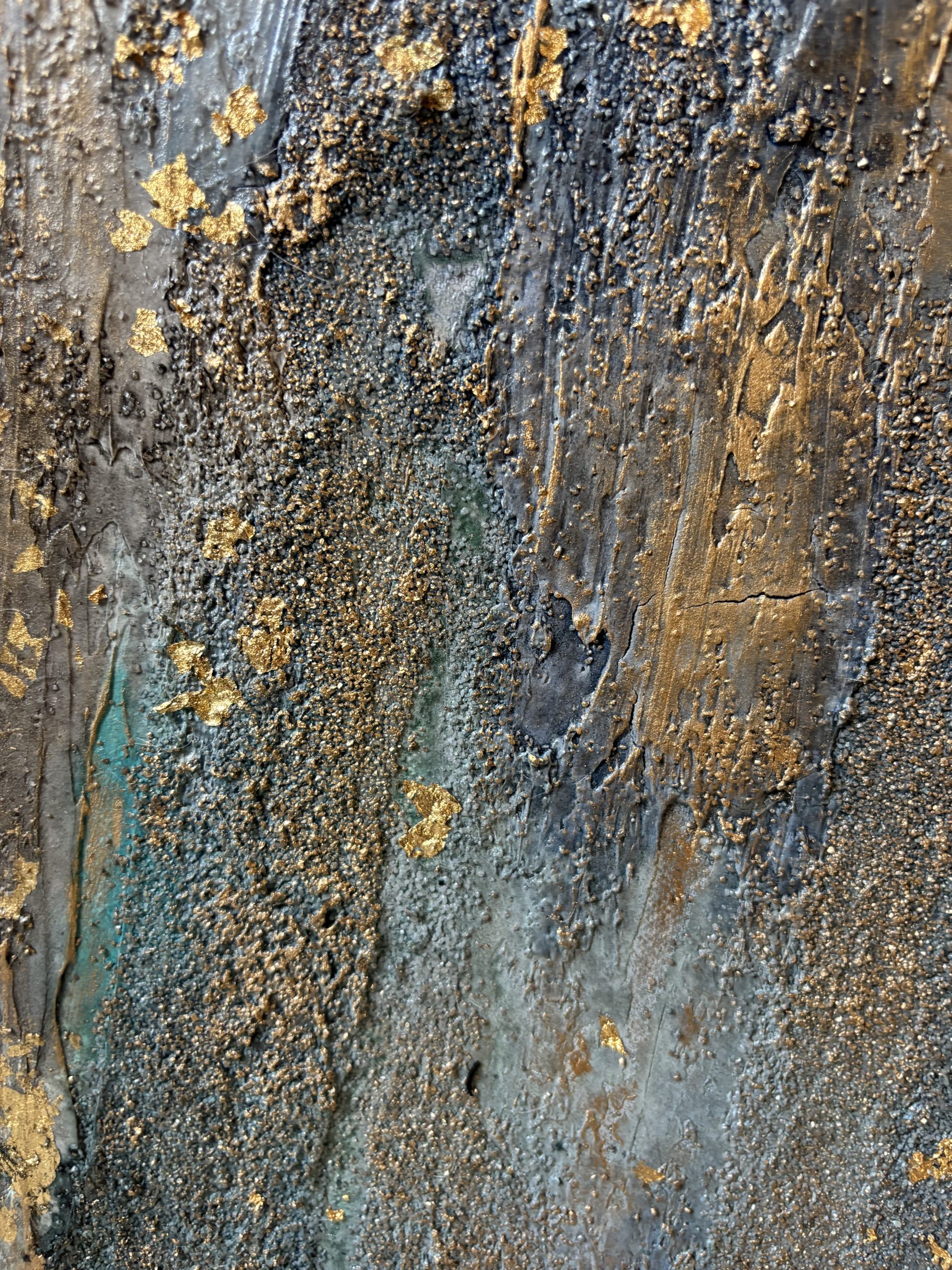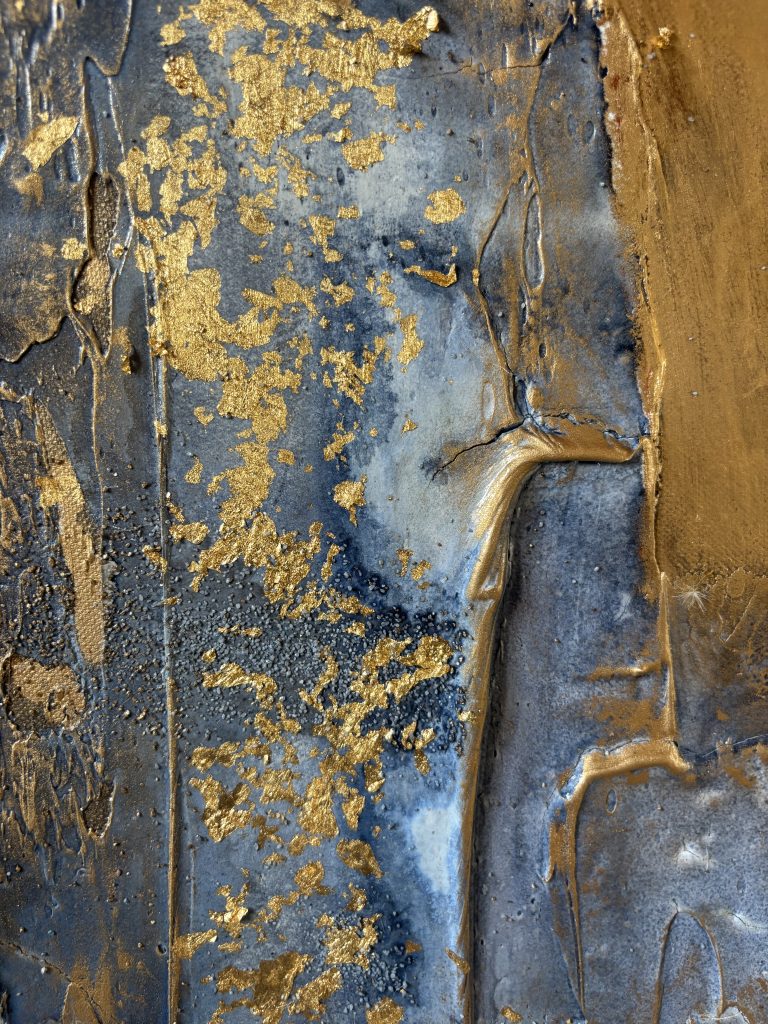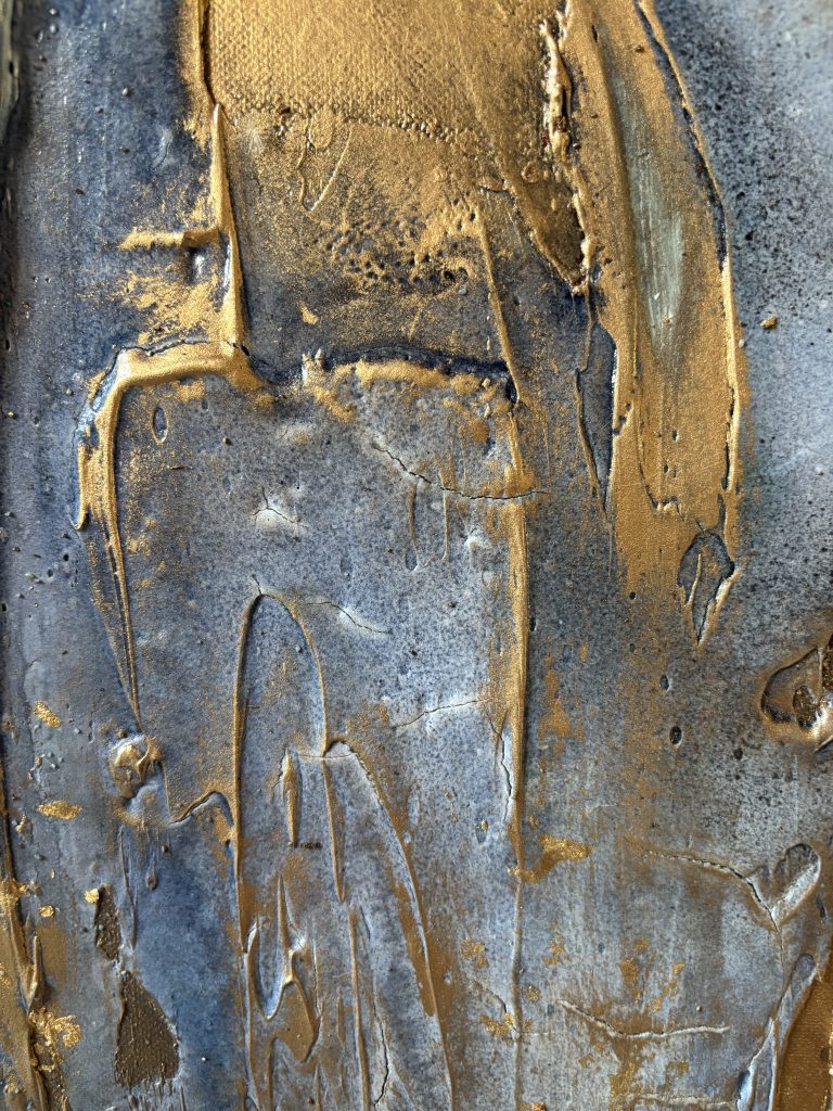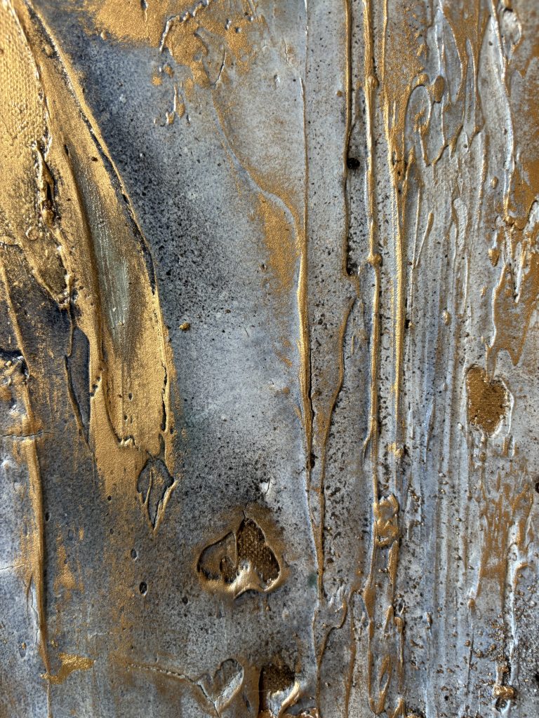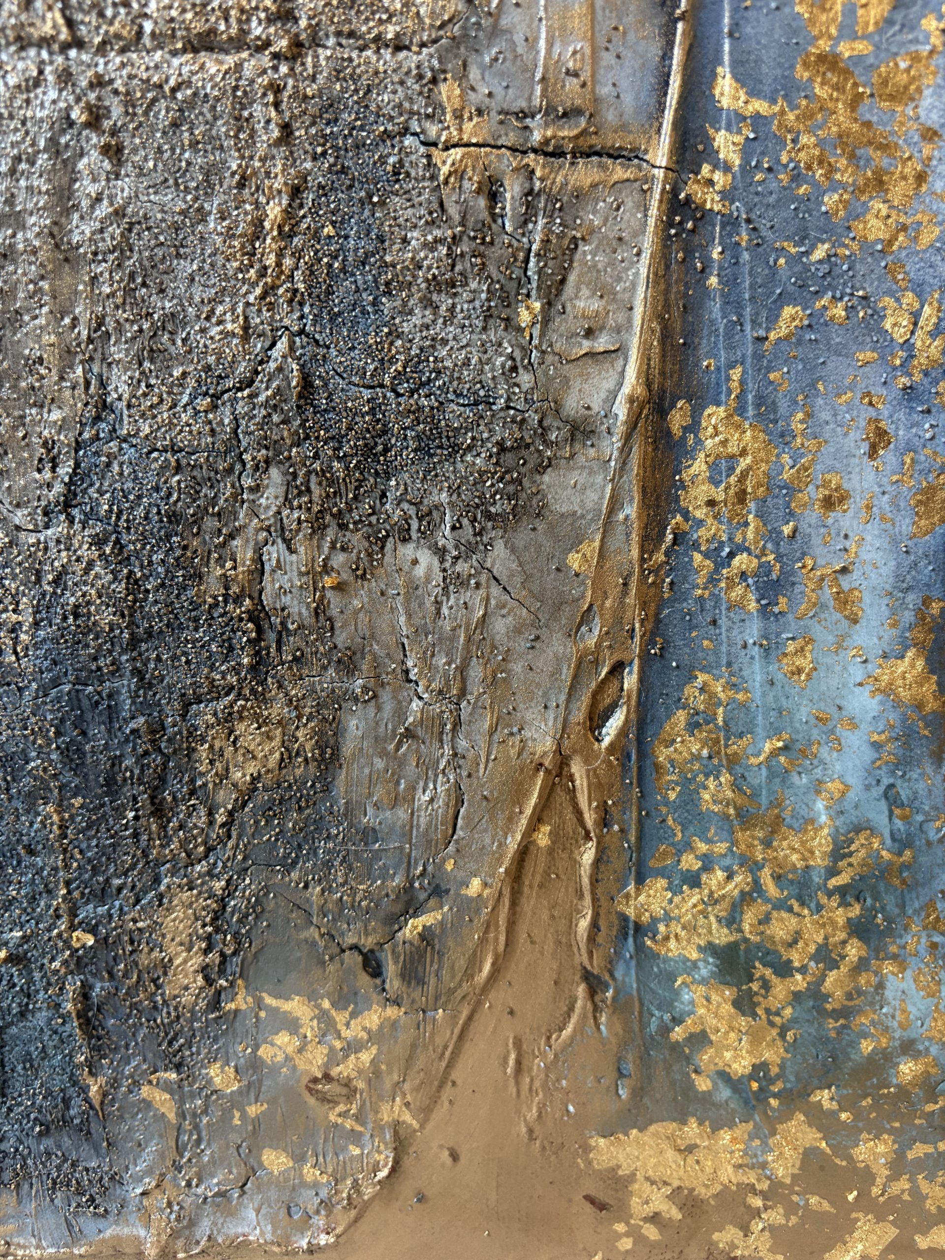 Enduit, gravillons. encre de Chine, feuille d’or et cire dorée