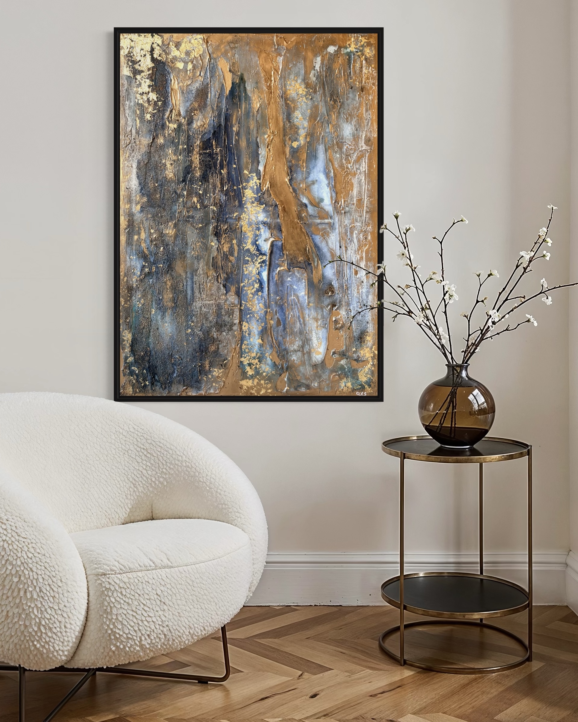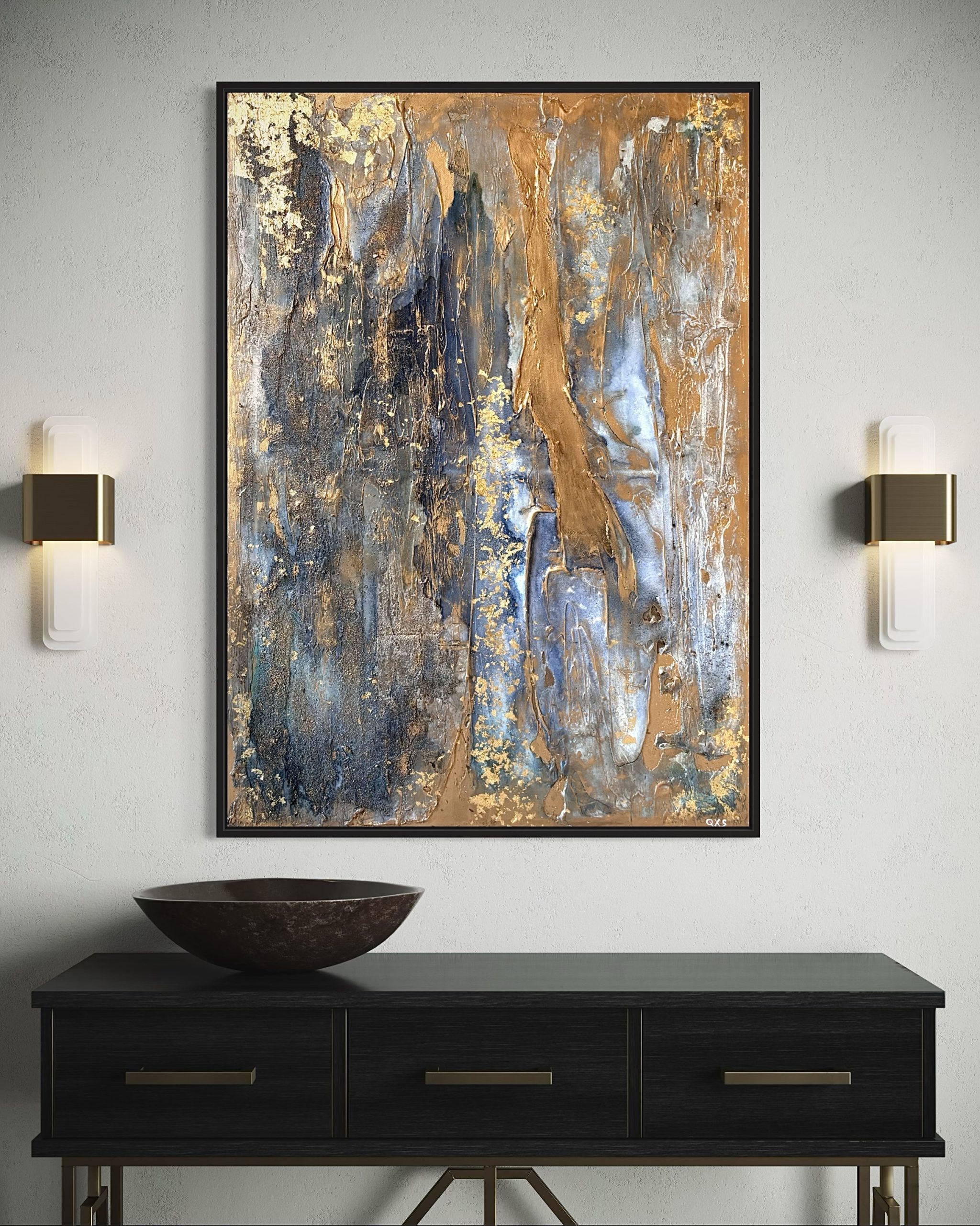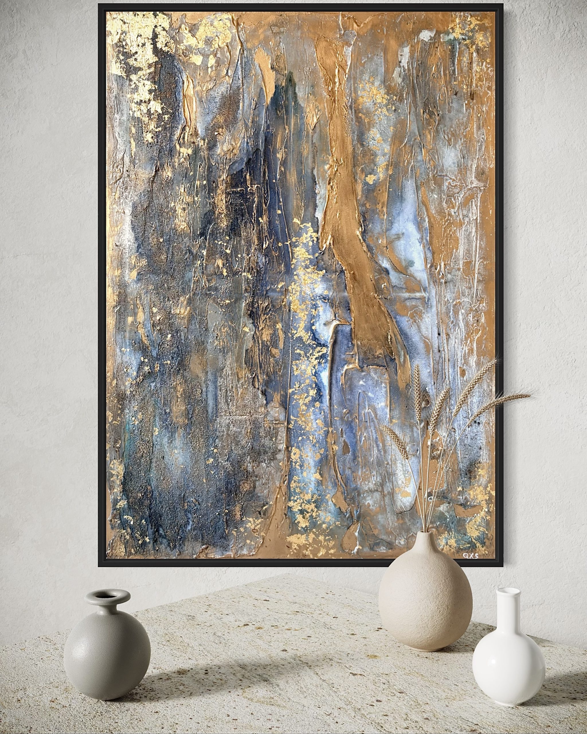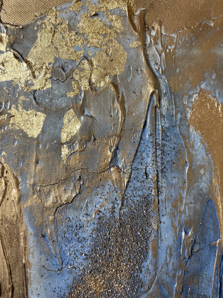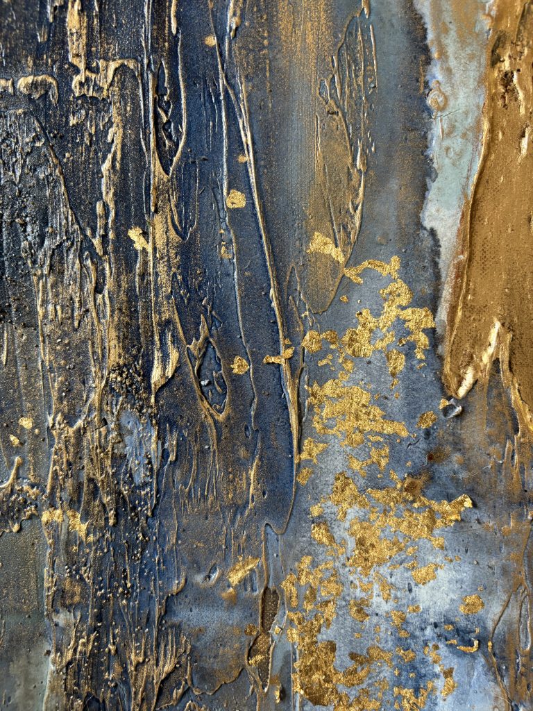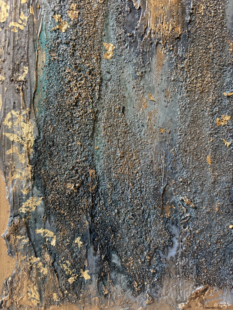 Enduit, gravillons. encre de Chine, feuille d’or et cire dorée